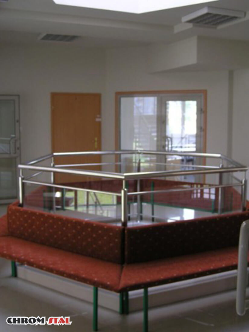 Wyjątkowo ładny projekt wykończeń z chromoniklu w Bibliotece w Przemyślu. Balustrada ze stali nierdzewnej łączona z szkłem bezpiecznym mocowana od góry.
